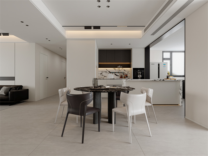 以黑白灰为主色调,营造出简洁大气的氛围。圆形大理石餐桌搭配黑白餐椅,时尚感十足,中岛与厨房的结合增强了空间互动性,同时提供额外操作与收纳空间。